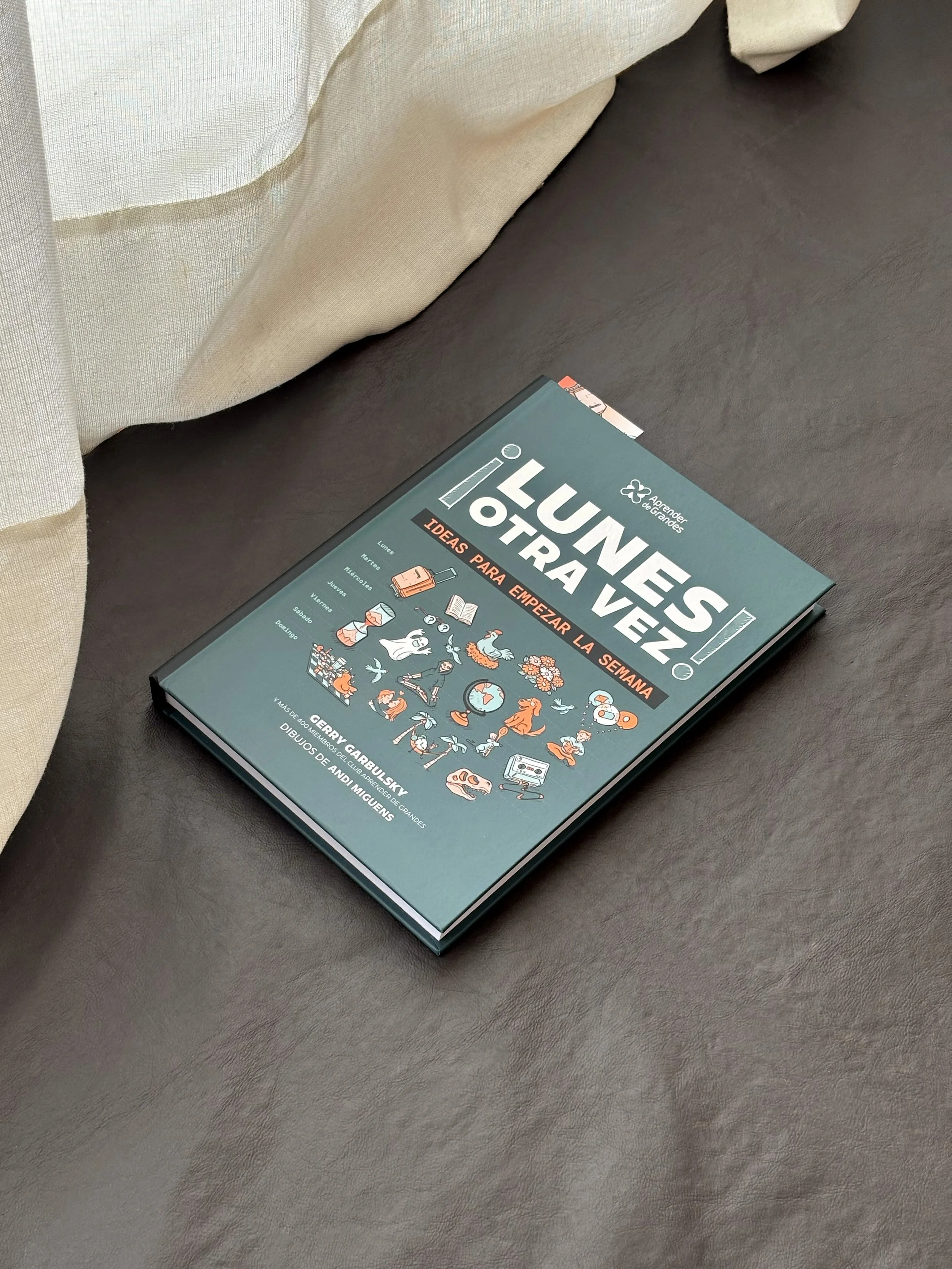 El libro de Aprender de Grandes con 52 Ideas para empezar la semana, comentarios de los miembros del Club Aprender de Grandes y dibujos del gran Andi Miguens.